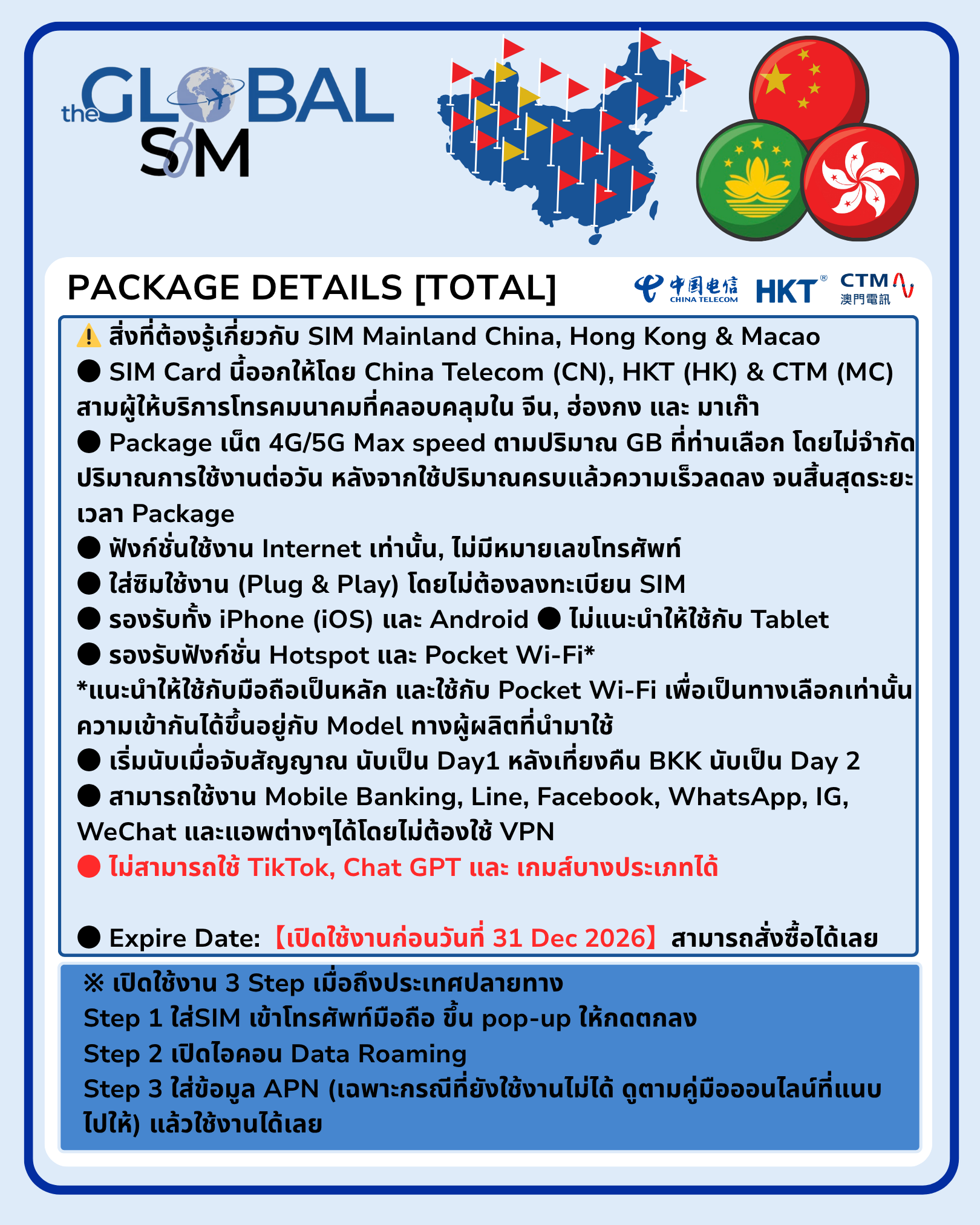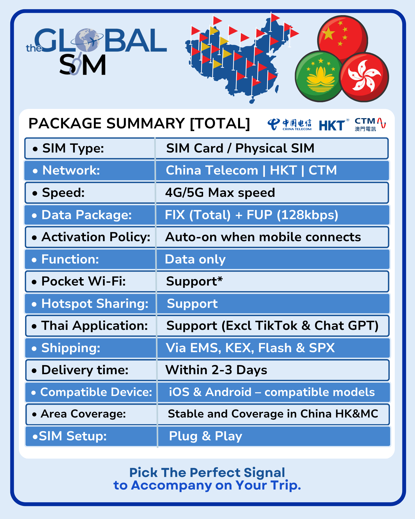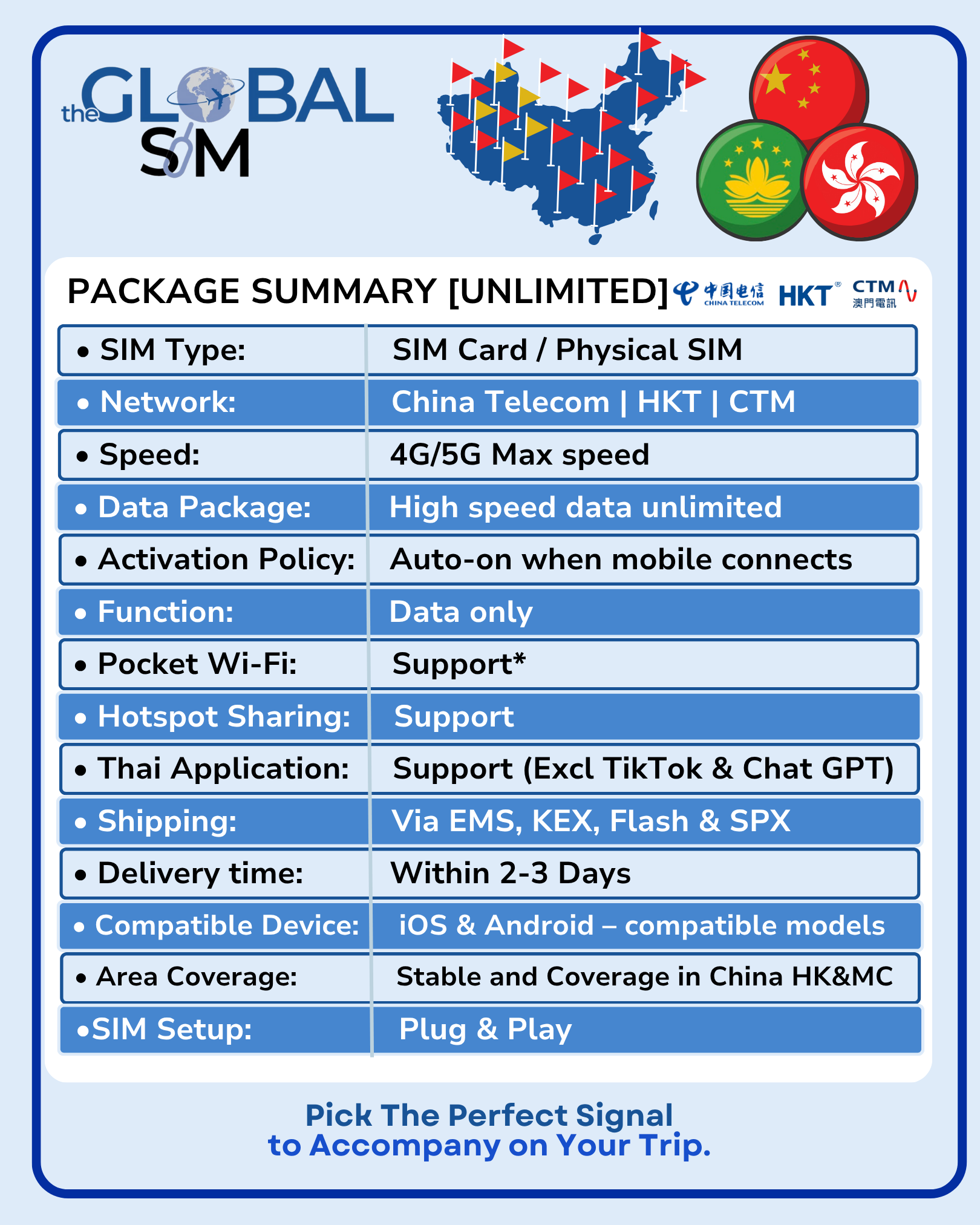 • Network: China Unicom (CN) | CSL (HK) | CTM (Macao)