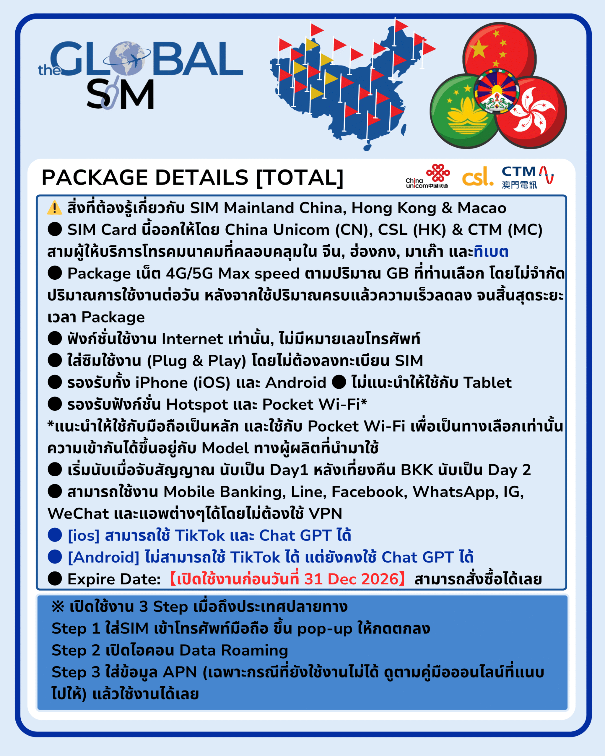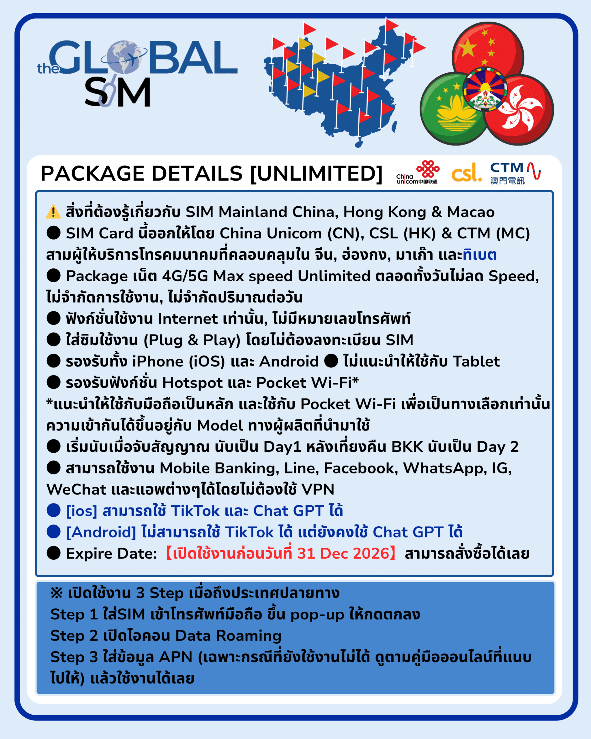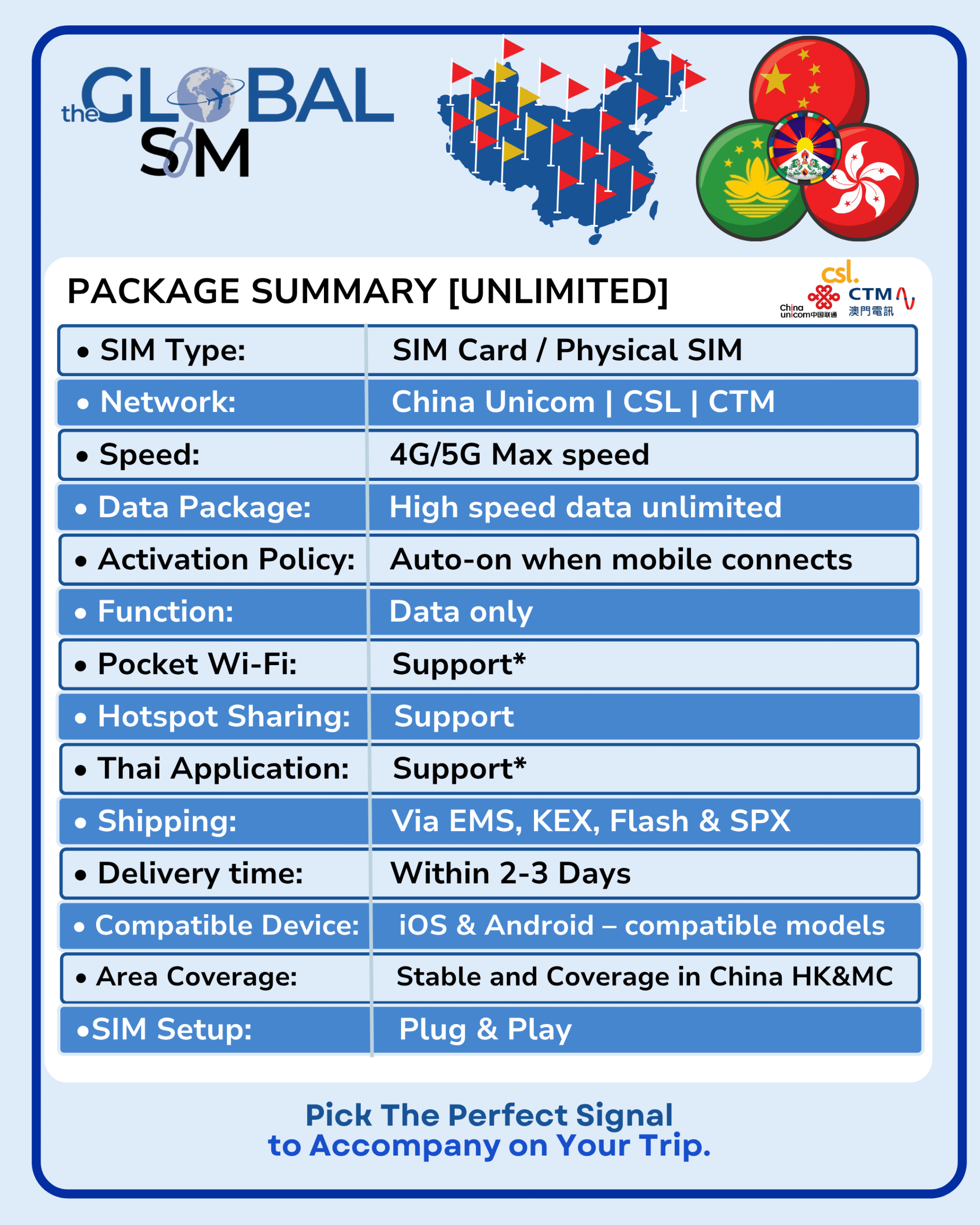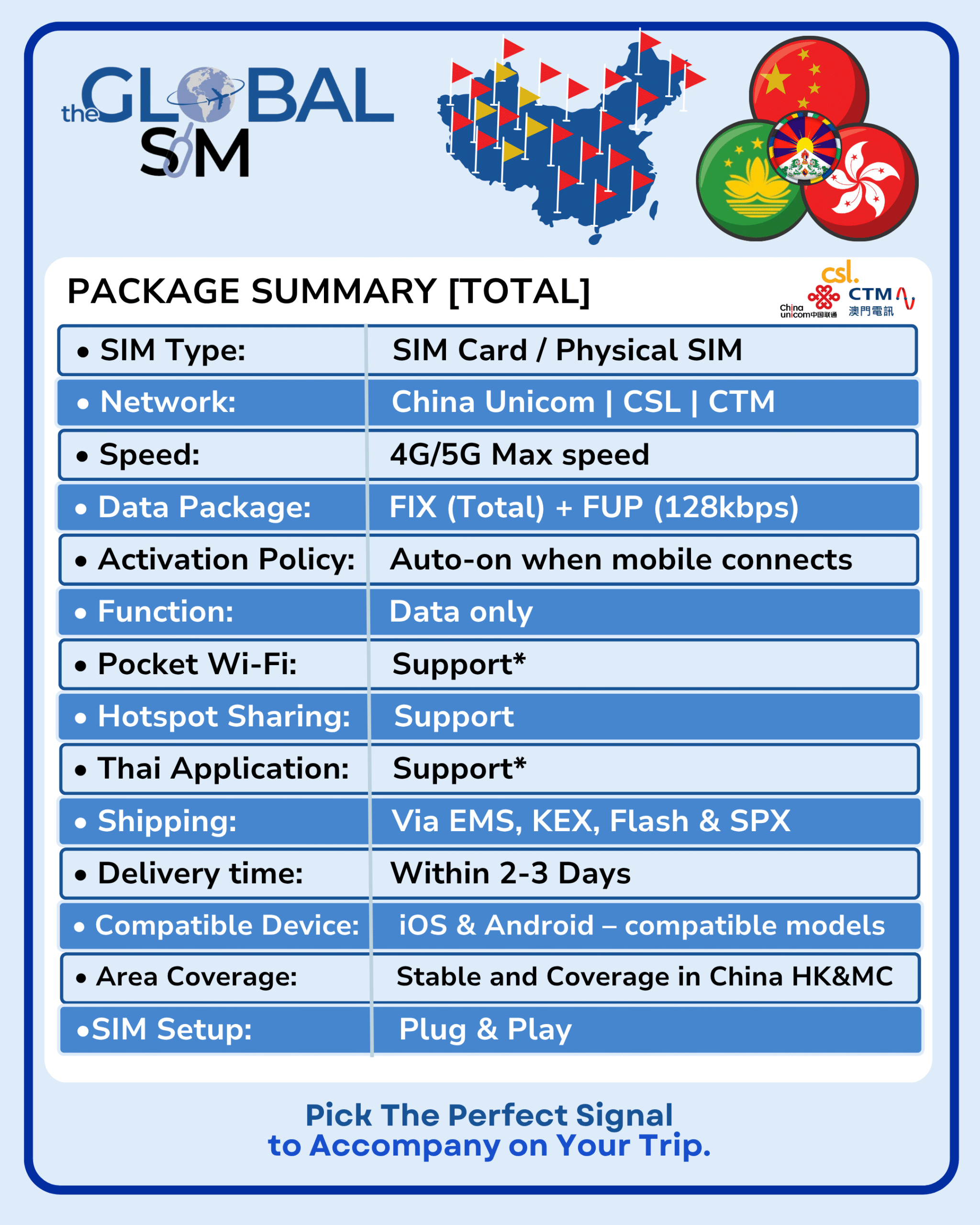 • Network: China Unicom (CN) | CSL (HK) | CTM (Macao)