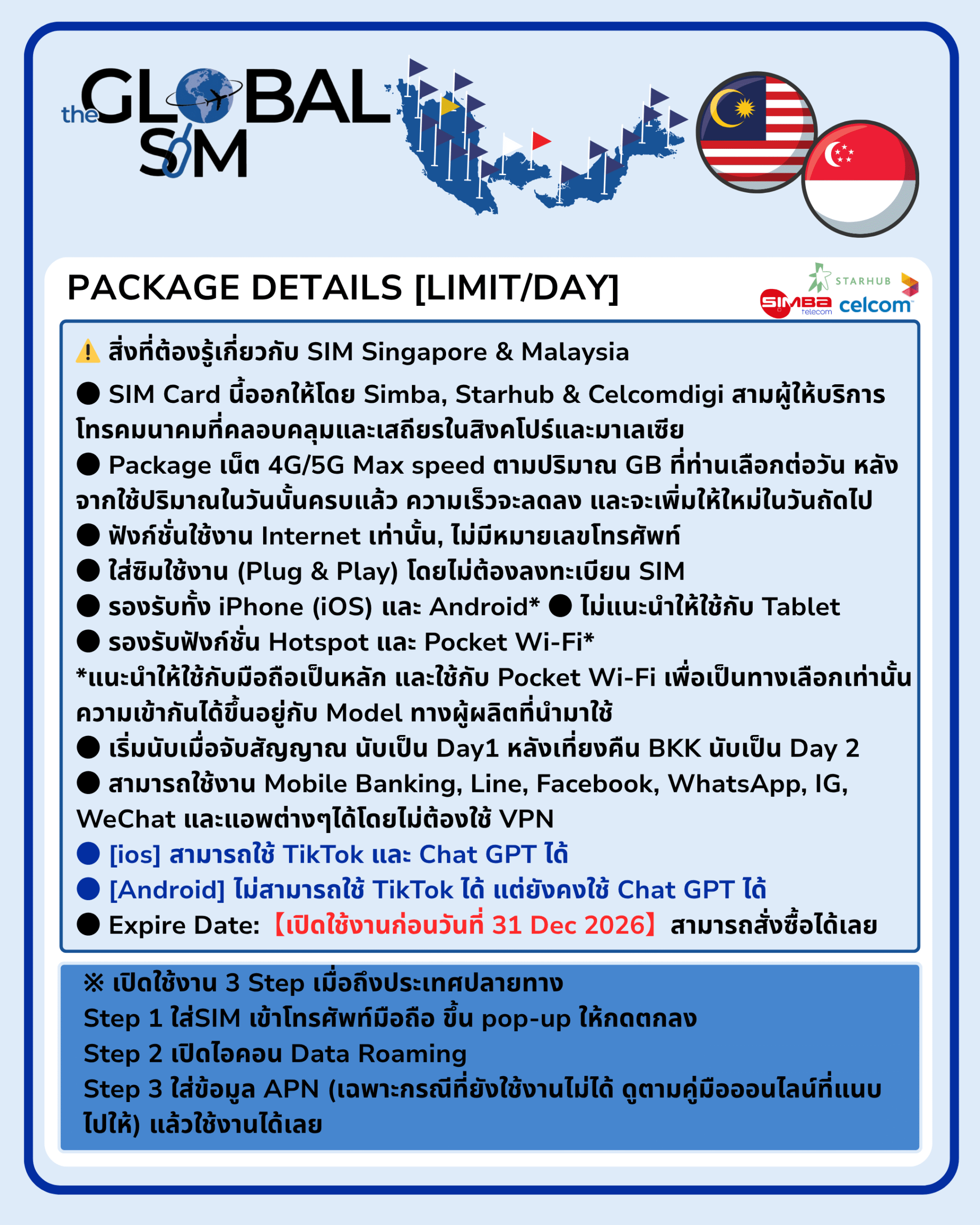• Network: Simba,Starhub (SGP) & Digi,Celcom, (MYS)