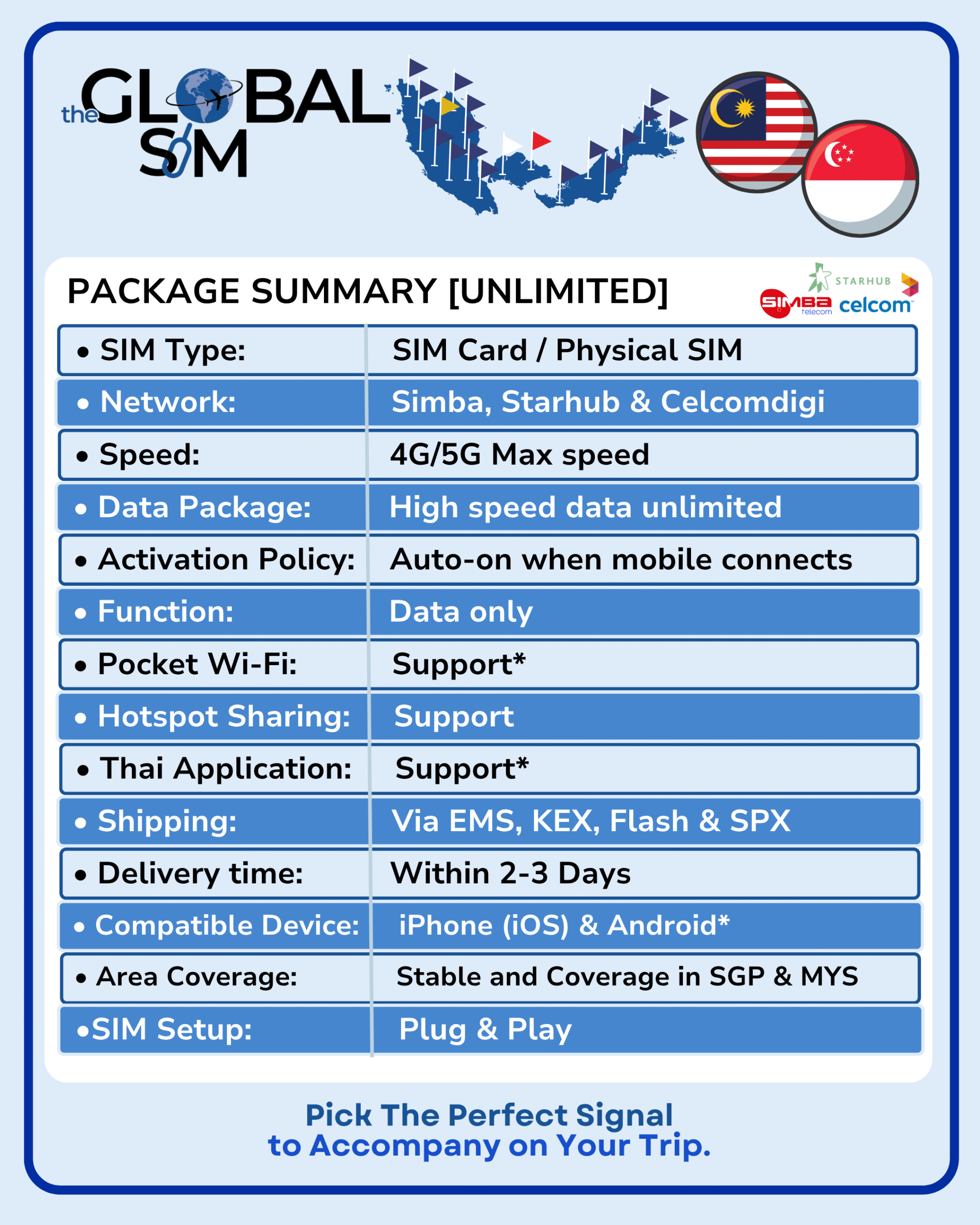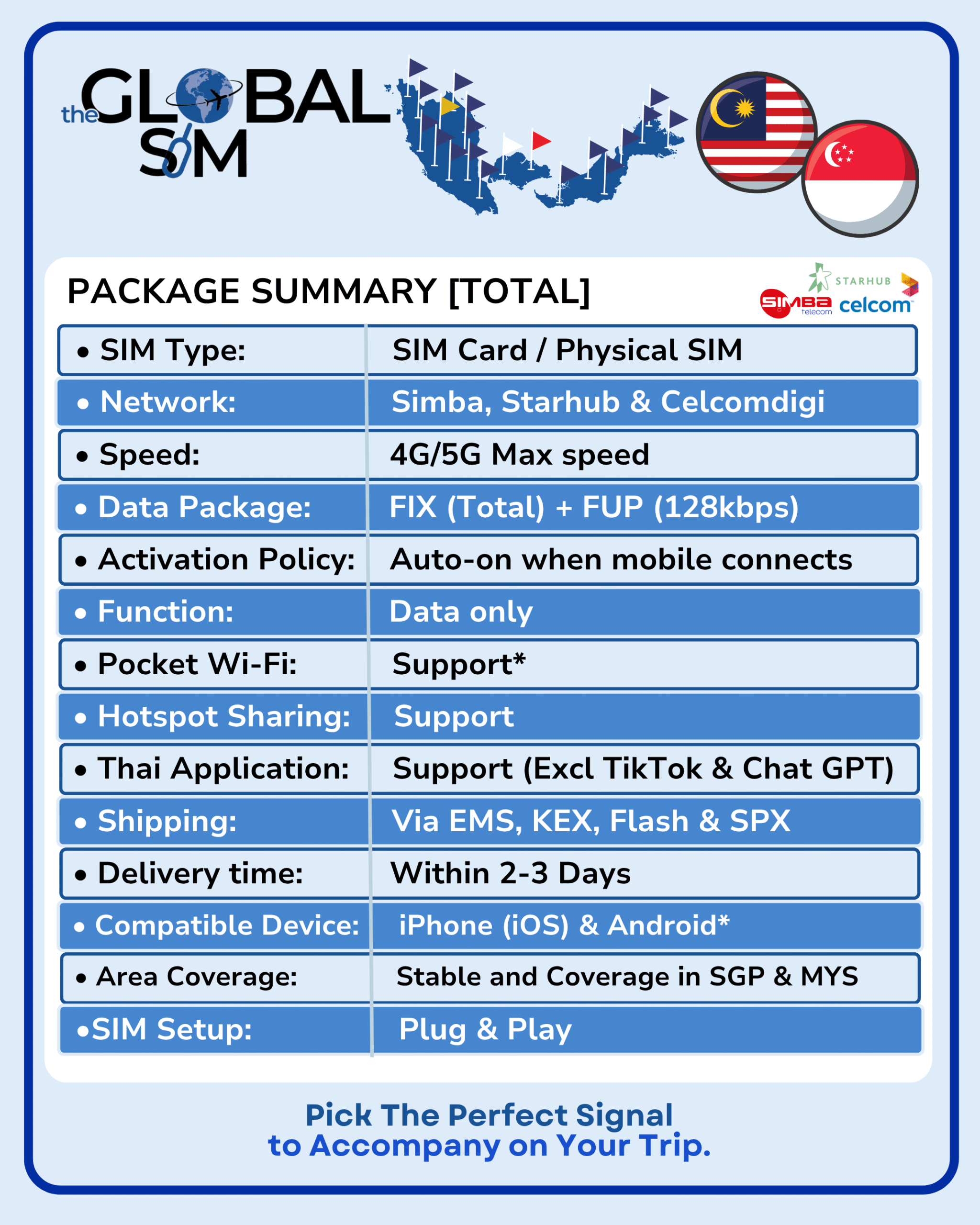 • Network: Simba,Starhub (SGP) & Digi,Celcom, (MYS)