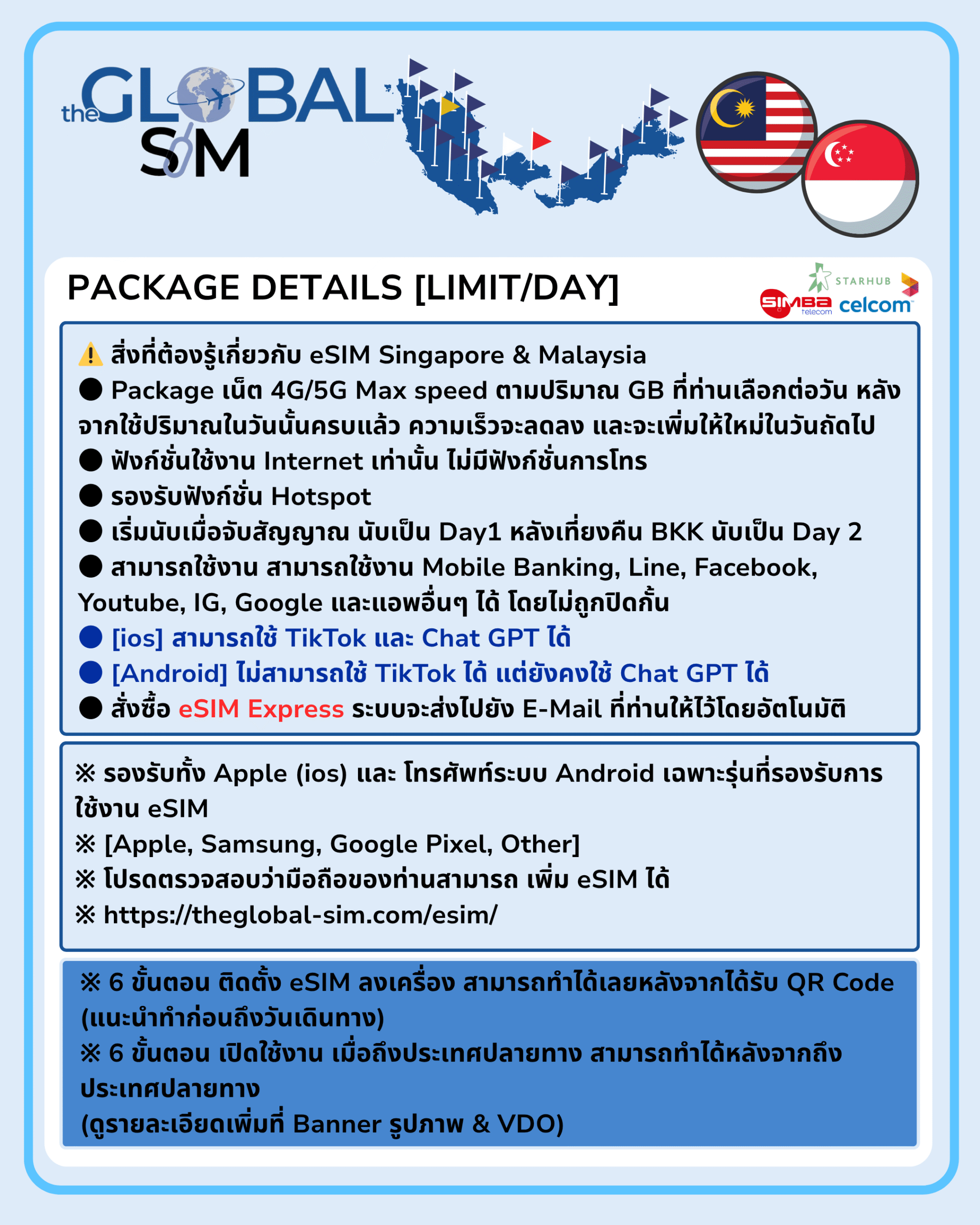 • Network: Simba, Starhub (SGP), Digi,Celcom, (MYS),