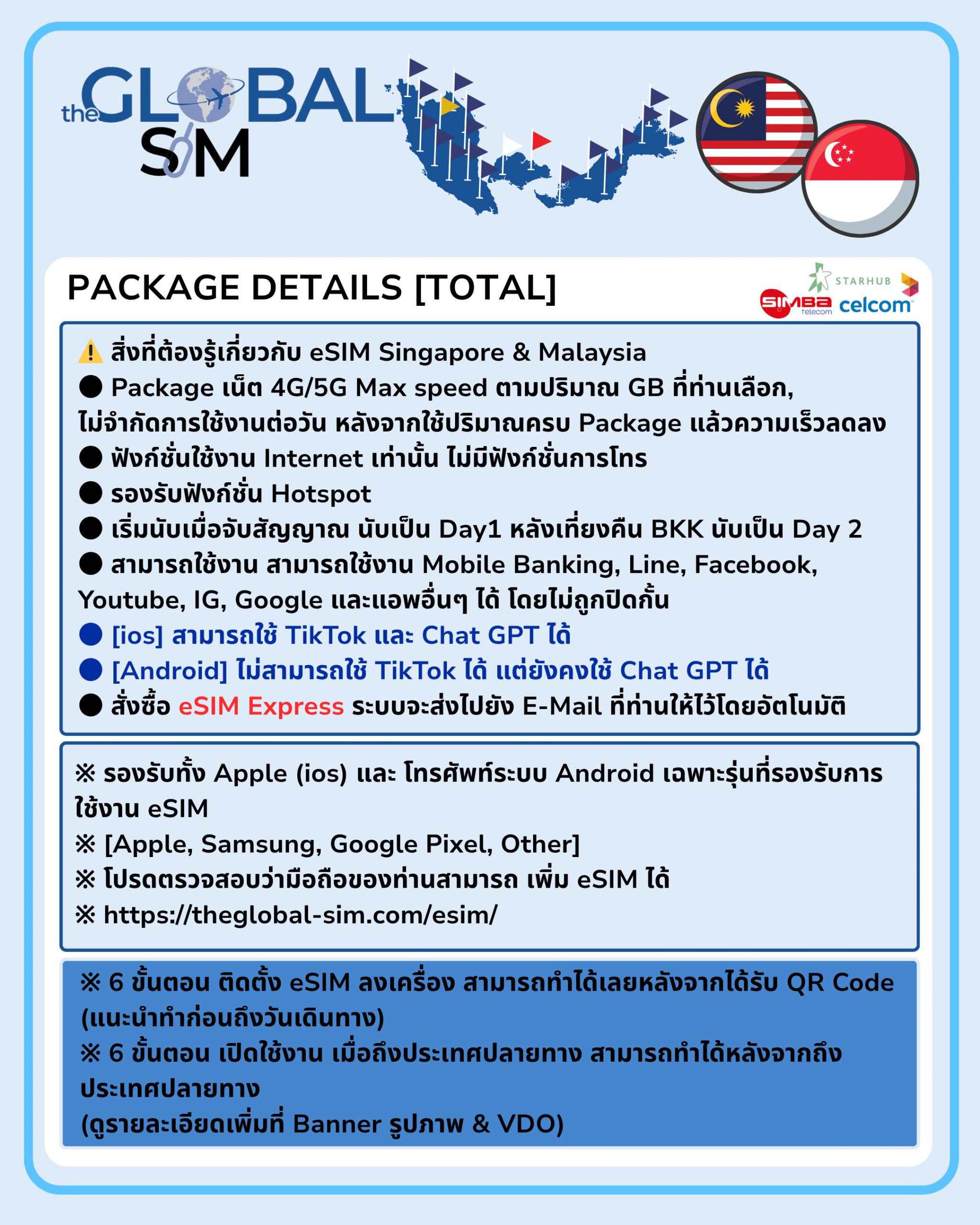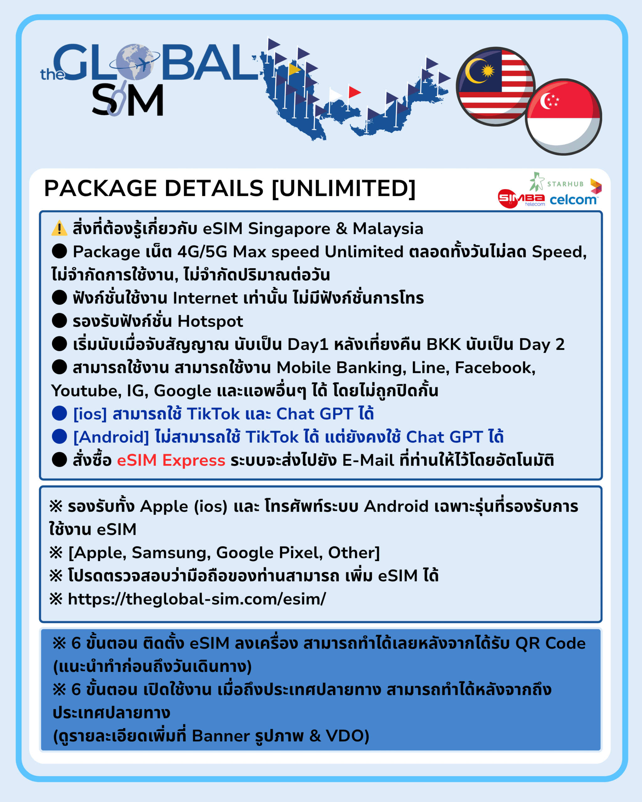 • Network: Simba, Starhub (SGP), Digi,Celcom, (MYS),